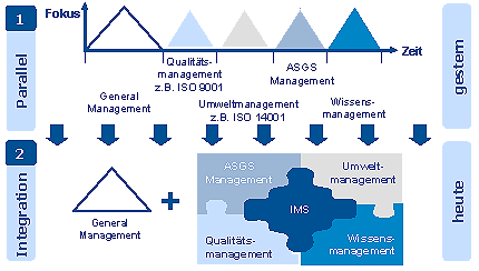 GlossarIntegrierte Managementsysteme (IMS)Kunden sowie gesetzliche und soziale Zwänge erfordern heutzutage die Einführung weiterer Managementsysteme. Ausgehend von einem gesteigerten Qualitätsbewusstsein der Kunden nehmen vermehrt Aspekte des Umweltschutzes und der Arbeitssicherheit Einfluss auf das Tagesgeschäft der Unternehmen: